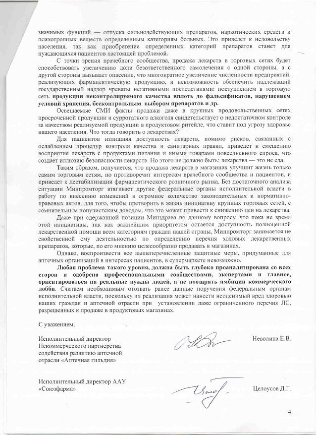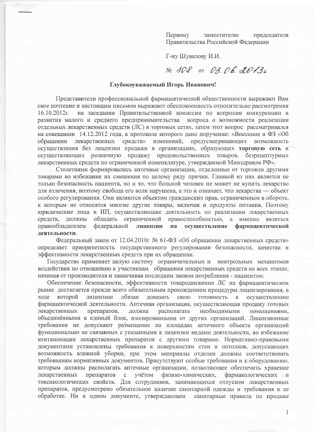 Коллективное письмо фармацевтических ассоциаций Шувалову И.И.